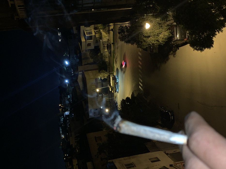At night, a hand holds a lit cigarette or joint, smoke curling into the air