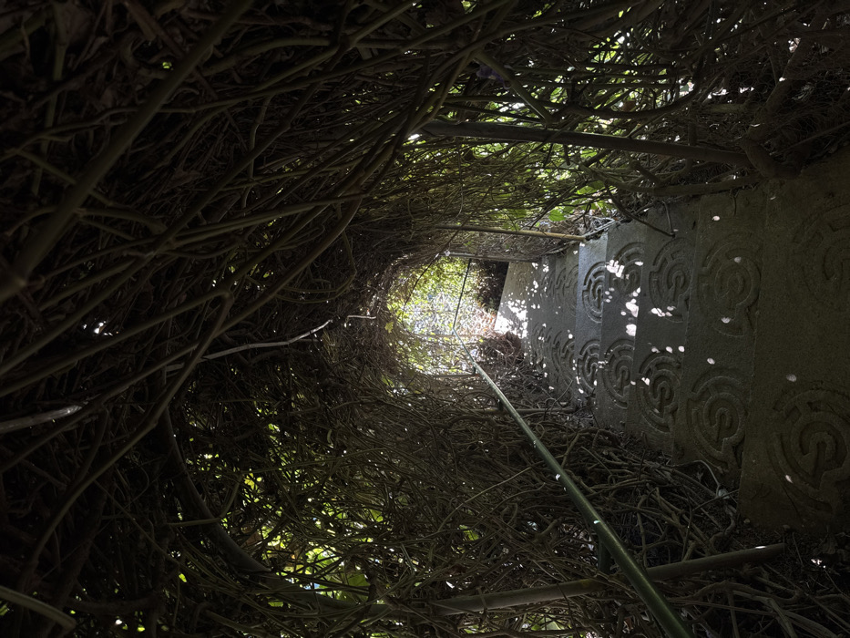 A low-angle shot depicts stone steps with maze-like engravings, leading upwards through a tunnel of dense, tangled vines and branches. Light filters through the foliage, casting dappled shadows on the steps. The tunnel's walls are composed of interwoven plant life, creating a sense of enclosure. A single bamboo pole lies diagonally across the steps.