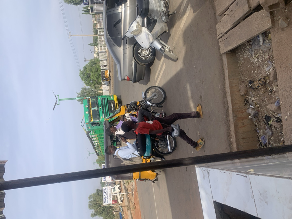 A street scene shows several vehicles including a gray car, a white scooter, a green truck, and a yellow motorized tricycle, all stationary on a paved road. Three people are seated on the tricycle. One wears a red shirt and dark pants, another a white shirt and dark pants, and the third a blue shirt. A motorcycle is partially visible alongside the tricycle. Litter is seen in the gutter at the edge of the road. Buildings and trees are visible in the background under a clear sky.