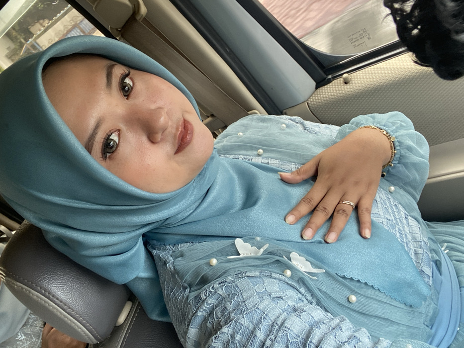 An adult female is depicted in a close-up portrait inside a vehicle. She wears a teal-colored hijab and a matching formal dress or top. The garment features lace-patterned sleeves and a sheer overlay on the torso, decorated with white pearl-like beads and three white butterfly appliques on the upper left chest. Her right hand, adorned with a thin ring on the ring finger and a gold-colored bracelet on the wrist, is positioned across her chest. Her face is made up with defined eyebrows, winged eyeliner, and brown lipstick, and she appears to have light-colored contact lenses. She looks directly at the camera. Behind her, a grey vehicle seat headrest is visible on the left, with a partial view of another person's arm or shoulder. To her right, a vehicle door panel and a blurred outdoor background through a window are present. The immediate environment is the interior of a car. The specific location within Sumorame, Indonesia, is not identifiable from the visual content of the image.