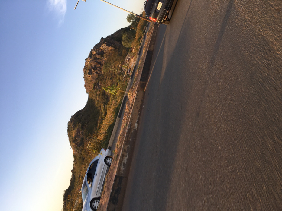 This outdoor scene in Jos, Nigeria, captures a multi-lane asphalt road with a raised dirt embankment and natural hills in the background