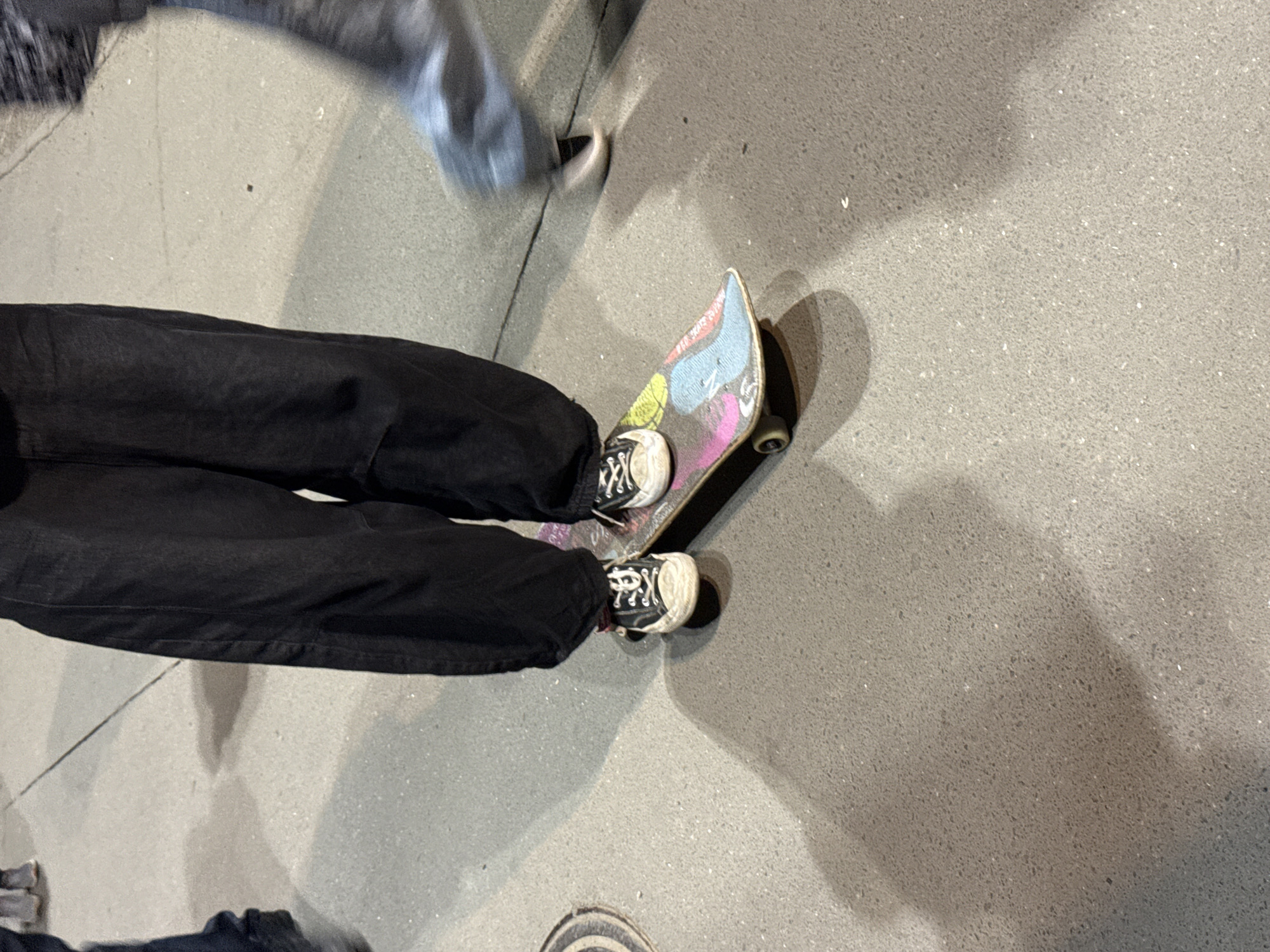 person in black pants and black and white sneakers standing on a skateboard on a gray concrete surface