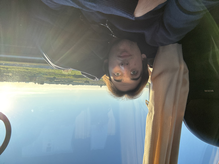 A young male subject with light brown hair and a surprised expression, characterized by wide-open eyes and a slightly agape mouth, is depicted in a selfie-style photograph. He is wearing a dark blue long-sleeved garment and appears to be seated inside a vehicle, likely a bus or coach. To the subject's left, a dark-colored seat headrest is visible, bearing the white text "MAN." Adjacent to the seat is a beige fabric curtain or blind. The right side of the image is dominated by a large window overlooking a bright, clear blue sky. The sun is low on the horizon to the right, creating significant lens flare and glare on the window glass. Beyond the window, the landscape consists of expansive, flat green fields, with faint silhouettes of structures or trees visible in the distant horizon line. The scene is illuminated by natural sunlight, suggesting either early morning or late afternoon. The location depicted is within or in transit through the city of Ladispoli, Italy.