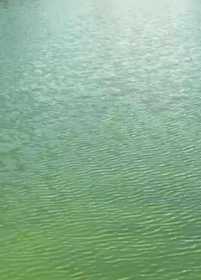 calm, green-tinted body of water, possibly a lake or pond. Gentle ripples spread across the surface, disturbed by a light breeze. In the distance, the outline of trees can be seen on the opposite shore.