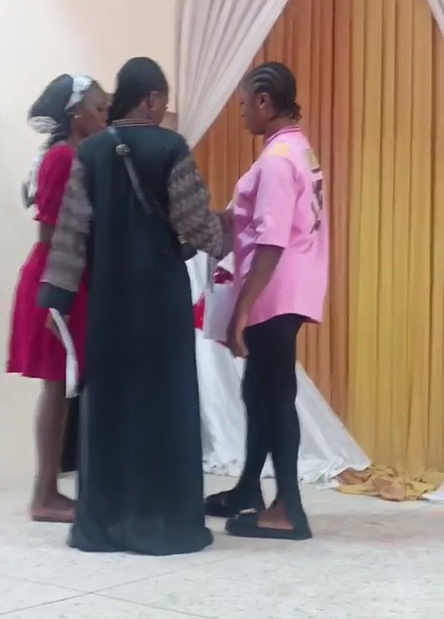 Three women are standing in a room. One woman is wearing a red dress, a head covering, and holding papers. Another woman is wearing a black dress with patterned sleeves and carrying a black bag. The third woman is wearing a pink short-sleeved shirt, black pants, and black slides. She is holding a white object. The women are standing in a group and appear to be talking or interacting with each other. Behind them is a backdrop of white and gold curtains.