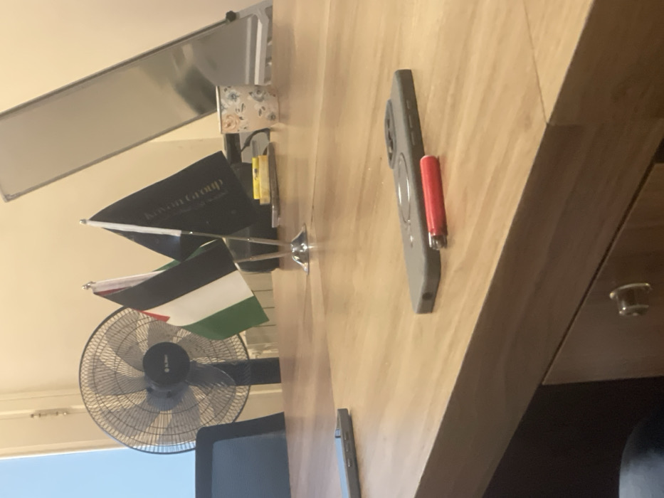 The scene depicts an indoor environment, specifically an office or meeting room, located within the Al-Muhajerin Municipality, Syria. A large, light-brown wooden table occupies the foreground and midground. On the table, in the midground, a chrome-colored stand holds two small flags: one displaying the Palestinian flag (black, white, green horizontal stripes with a red triangle), and another black flag with white text partially visible, appearing to read "Karam Group." To the right of the flags, a floral-patterned paper cup and a stack of small yellow notepads are visible. Further to the right, a tall, slender, reflective surface, possibly a mirror or whiteboard, leans against a wall. In the foreground, on the table's surface, a grey smartphone case with a circular magnetic attachment on its back is positioned horizontally. Adjacent to it, a red cigarette lighter lies horizontally. Further to the left on the table, another grey smartphone is partially visible. In the background, behind the table, a black pedestal fan with a mesh guard is visible. To its left, the backrest of a black office chair, featuring a mesh design, is partially seen. The walls in the background are light-colored. Below the fan, a white radiator or heating unit is present. No people are visible, and no actions or interactions are depicted.