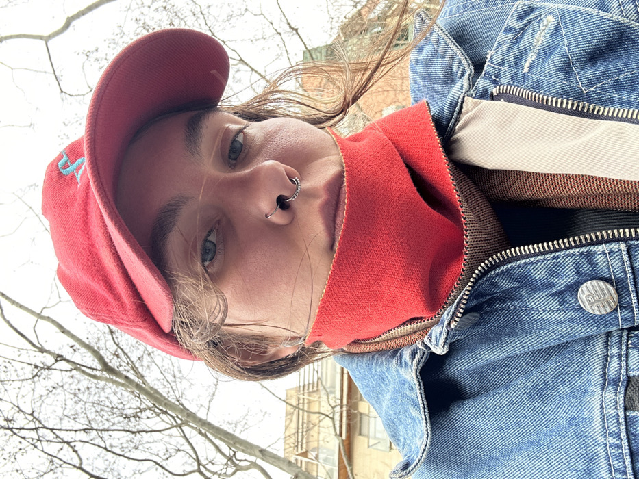 An individual is depicted in a close-up, upward-angled outdoor selfie. The person, appearing to be an adult, has blue eyes and light brown, medium-length hair. They wear a red baseball cap with a light blue embroidered logo and a blue denim jacket with a metal button displaying a "P" over "E" insignia on the lapel. A red and brown patterned scarf or neck warmer covers the lower face, obscuring the mouth and chin. Underneath the denim jacket, a light beige layer of clothing is visible. Piercings include a silver septum ring and a right nostril hoop earring adorned with small stones, alongside a plain silver hoop earring in the left ear. The background reveals an overcast sky and bare tree branches, suggesting a dormant season. A light-colored, multi-story residential building is partially visible behind the trees. No specific landmarks or unique architectural features are present in the image to definitively identify a precise location within Barcelona, Spain. The scene suggests an urban area with natural elements.