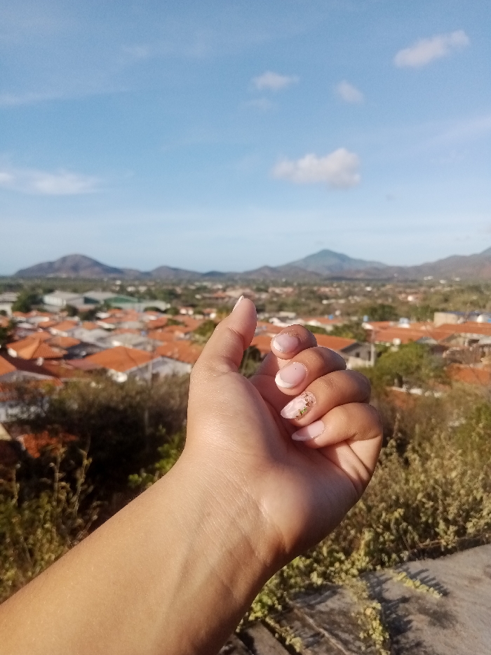 A human left hand with light brown skin is prominent in the foreground, positioned with fingers slightly curled and the thumb extended upwards. The fingernails are manicured in a French tip style with white tips and a clear base, featuring gold-toned flecks as an accent on the ring and middle fingers. The hand is depicted from an elevated vantage point, overlooking the city of Altagracia, Venezuela. The midground reveals a dense urban expanse of buildings, predominantly characterized by orange or reddish-brown tiled roofs, interspersed with green trees and foliage. In the background, a series of dark green and brown mountains and hills stretch across the horizon beneath a light blue sky with scattered white cumulus clouds. The scene is illuminated by natural daylight.