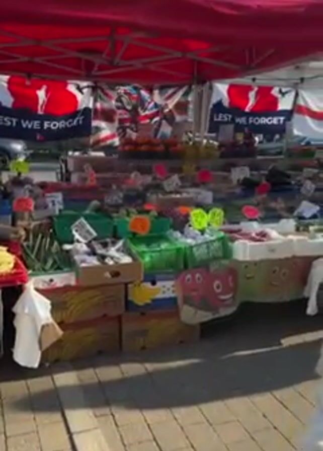 white dog on a leash walking through an outdoor market. There are various produce stands with colorful fruits and vegetables displayed under red and white tents. Some tents feature British flags and "Lest We Forget" banners. People are browsing the market and making purchases. The dog continues walking along the sidewalk, passing by storefronts and other pedestrians. The street is paved with light gray bricks, and the sun is shining, casting shadows along the path.