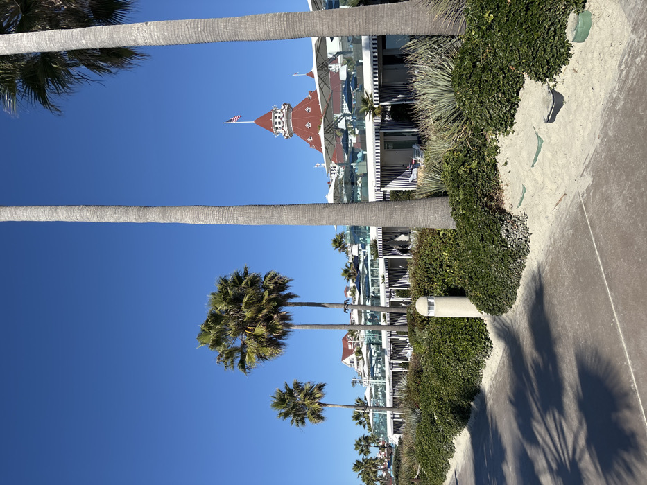 - "Palm trees line a clear blue sky, framing the iconic red-roofed Hotel del Coronado" by FM-acnJb2, licensed under CC BY 4.0