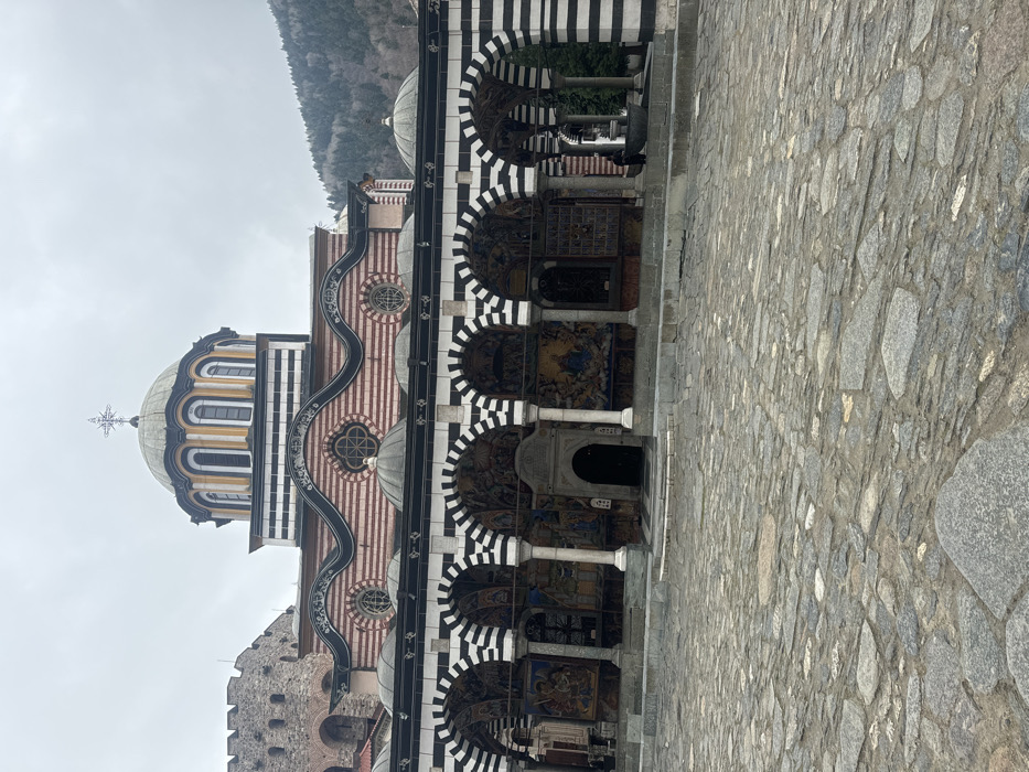 The image displays the internal courtyard of the Rila Monastery, located in Rilski manastir, Bulgaria