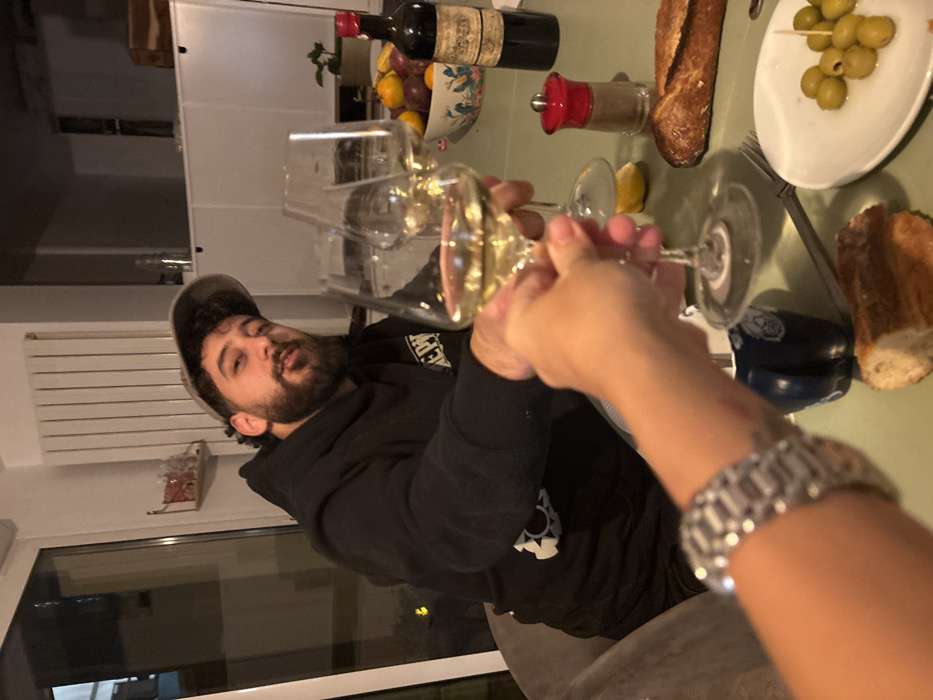 This image captures an indoor dining scene in Cachan, France. Two individuals are present, engaging in a toast at a light-colored table. A male subject is seated on the left, facing the viewer. He has a dark beard and mustache, wears a grey baseball cap reversed, and a black hooded sweatshirt with white graphic elements. His right arm is extended, holding a clear stemware glass containing a light-colored liquid, likely white wine. He maintains eye contact with the camera. In the foreground on the right, the arm and hand of a second individual are visible, extended towards the male subject. This individual wears a metal link bracelet on their wrist and holds an identical stemware glass with the same light liquid, participating in the toast. Their glasses meet in the central foreground of the image. The table, which appears to have a light green or grey surface, is laden with various items: - Three stemware glasses, two actively in use and one partially visible behind them. - A dark glass bottle, possibly wine, with a distinctive label, positioned on the far right. - A white bowl with a floral pattern, filled with assorted fruits including oranges and lemons. - Several pieces of crusty bread. - A white plate containing green olives, some skewered with toothpicks. - A red and transparent pepper or salt grinder. - A blue ceramic mug or small pitcher. - A fork and a lemon wedge. The background shows interior details, including a white wall with a radiator, white cabinetry, and a small decorative shelf holding items. A large window or glass door on the far left reveals a dark, indistinct outdoor area with a distant point of light.