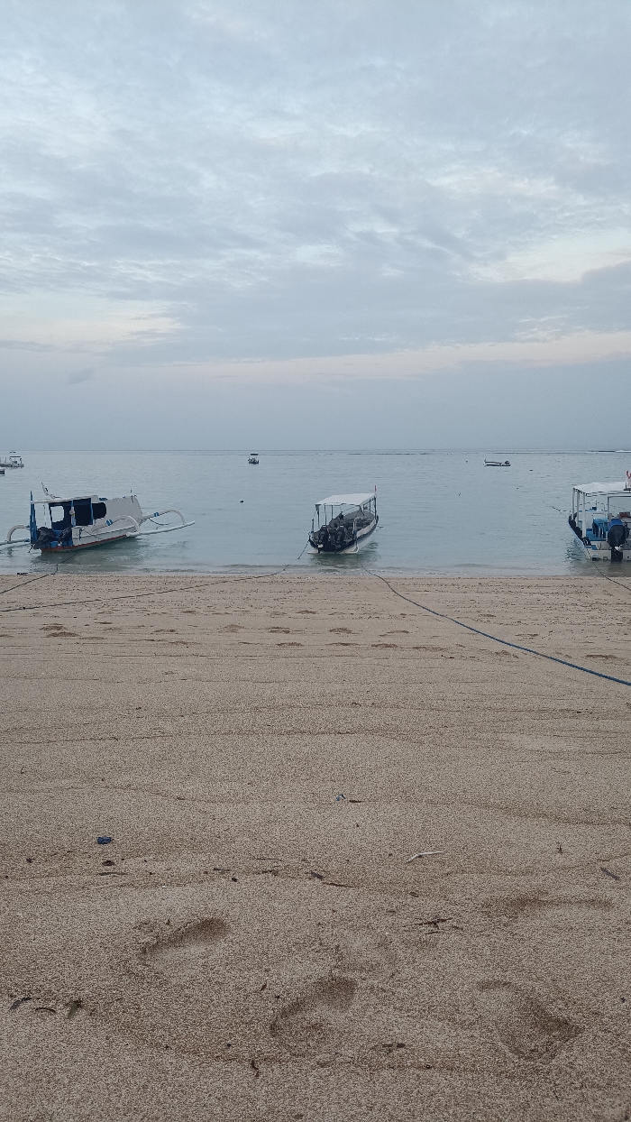 A tranquil beach scene under a cloudy sky. The foreground features tan sand with visible footprints. Several boats are anchored in the calm, light blue water. Ropes extend from the boats onto the beach. In the distance, the horizon blends seamlessly with the sky, creating a sense of vastness and serenity.