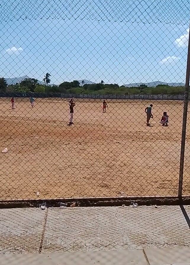 beach from above, viewed through a chain-link fence. The beach is sandy and there are several people walking on it. The water is visible on the left side of the frame. The sky is blue with a few clouds. There are some trees or bushes between the beach and the water. The video is shot from a high angle, looking down at the beach.