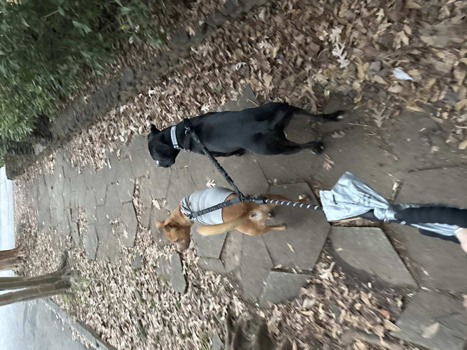 A black dog with a white collar and a tan dog wearing a striped shirt are being walked on a leash. They are walking along a stone path covered in leaves. A person is holding the leash, partially visible at the right. The image is taken from above, looking down at the dogs. Some greenery can be seen on the left.