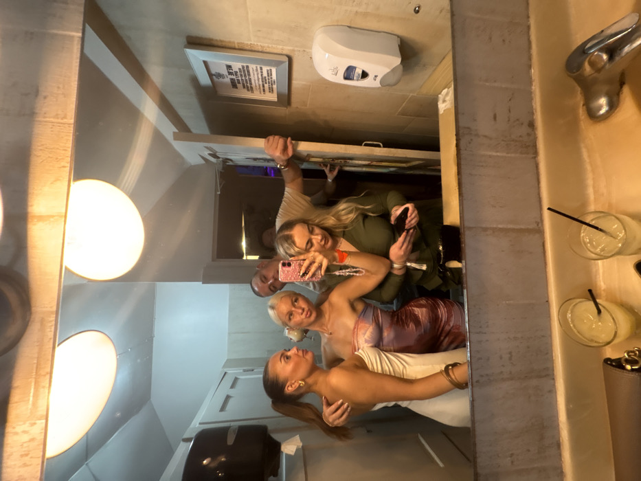 A mirror reflects five people posing for a photo in a bathroom. The reflection shows three women in the foreground, one in a white dress, another in a purple-toned dress, and the third in a green top, holding a phone. Two other people, a man and a woman, are further back. The bathroom features a soap dispenser, a framed sign, a sink with a faucet, and two cocktails with straws on the counter. The room is illuminated by bright overhead lighting.