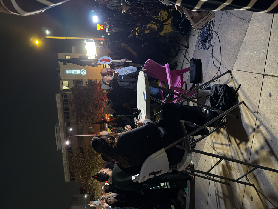 A night scene with several people gathered outside. In the foreground, two people are seated at a round table. Behind them, a crowd is visible, including individuals holding signs. In the background, a building with the words "FIT HOUSE" illuminated on its side is present. Streetlights cast a glow on the scene, and several microphones are visible, suggesting a press conference or public gathering.
