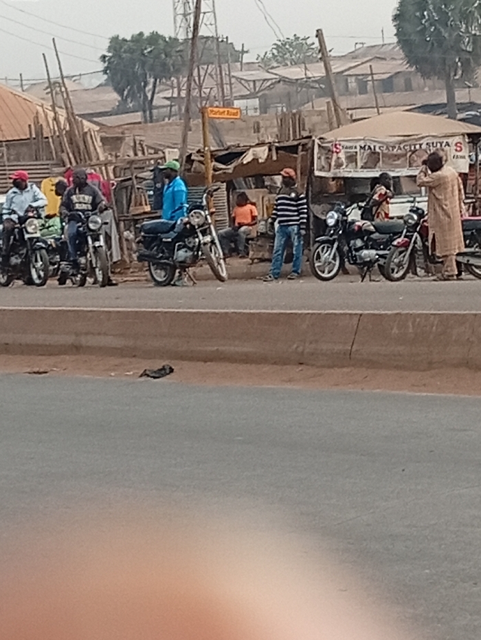 A street scene shows several motorcycles parked along the roadside. People stand near the motorcycles, with some appearing to be drivers or passengers. A small shop or stall stands in the background, partially obscured by a sign. Overhead power lines and a street sign marked "Market Road" are visible. The environment appears to be an urban or semi-urban area.