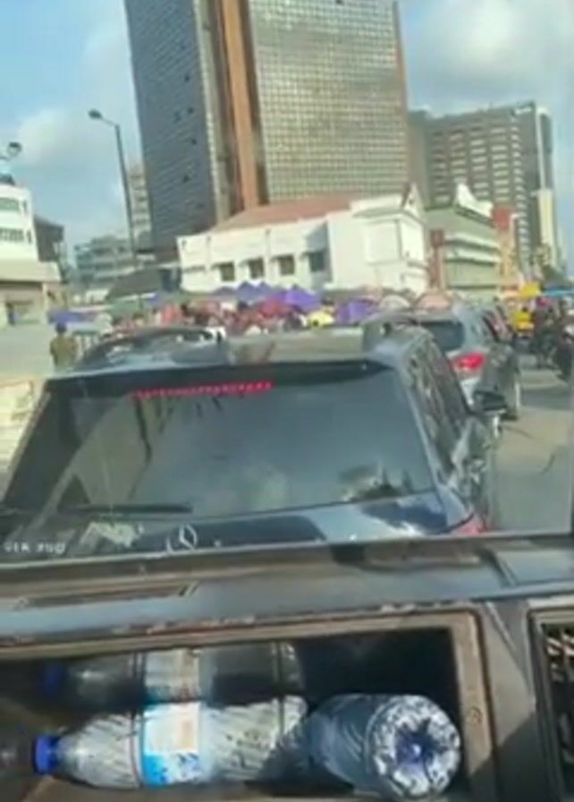 The video, captured from within a vehicle, shows a busy urban street scene in broad daylight. The camera is positioned behind the dashboard, revealing several water bottles stored in a compartment. Through the windshield, a line of stationary cars is visible. In the background, a modern skyscraper with "WEMA BANK" displayed on its top stands tall. Closer to the foreground, a bustling market area with colorful tents and numerous people can be seen. The overall environment appears crowded with significant traffic congestion.