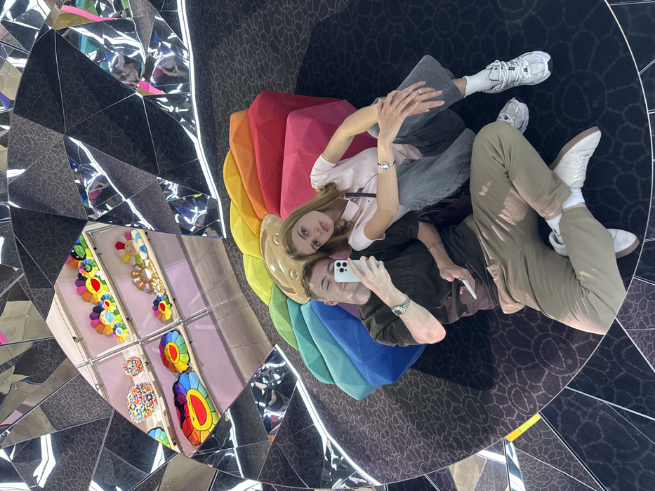 The image captures two individuals, a male and a female, situated in an art installation or retail space within the city of Chuo, Japan. They are positioned centrally in the foreground, leaning back against a large, segmented cushion in rainbow colors. The male, with short light brown hair, wears a dark t-shirt and tan pants, a silver watch on his left wrist, and light-colored shoes. He holds a white smartphone aloft with his right hand, pointed towards himself and the female, suggesting a selfie or video recording; another white smartphone rests on his lap. He displays a slight smile. The female, with shoulder-length light brown hair, wears a light pink polo shirt, grey jeans, and light grey athletic shoes, with a silver watch on her left wrist. She sits with her hands clasped in front of her, looking directly forward. The environment features a dark, patterned carpeted floor and a ceiling and upper walls constructed from multiple reflective, geometrically angled mirror panels, creating a kaleidoscopic reflection of the surroundings. Through a visible opening in this reflective structure, a display area is seen, featuring multiple shelves laden with colorful plush cushions shaped as smiling flowers (consistent with Takashi Murakami's "Murakami Flowers") and smaller, spherical, multicolored decorative objects.
