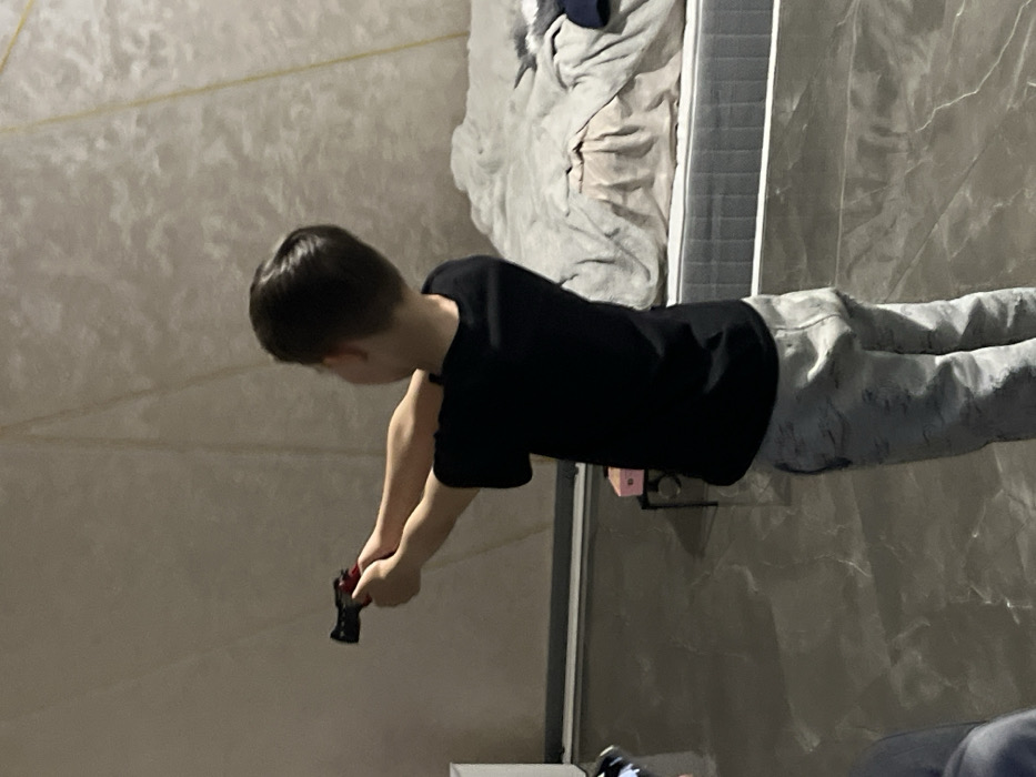 Within an indoor residence in the city of Ketoshi, Russia, a young male individual is depicted from a rear-right perspective, standing upright. The individual, appearing to be a child, has short, dark hair and is wearing a black short-sleeved t-shirt and light-colored, patterned long trousers. Both hands are extended forward, holding a black and red toy pistol in an aiming posture. The immediate background features a light-colored, textured wall with faint diagonal and irregular patterns. To the individual's right, a mattress without a bed frame is visible, covered by a rumpled grey duvet and dark clothing items. To the individual's left, a partial view of a white rectangular object, possibly a piece of furniture, is present. A small dark table or stand with a pink box is partially visible behind the individual. The floor is dark and reflective, displaying lighter, irregular vein-like patterns. A portion of another person's arm, clad in a blue sleeve, is visible in the lower left foreground.