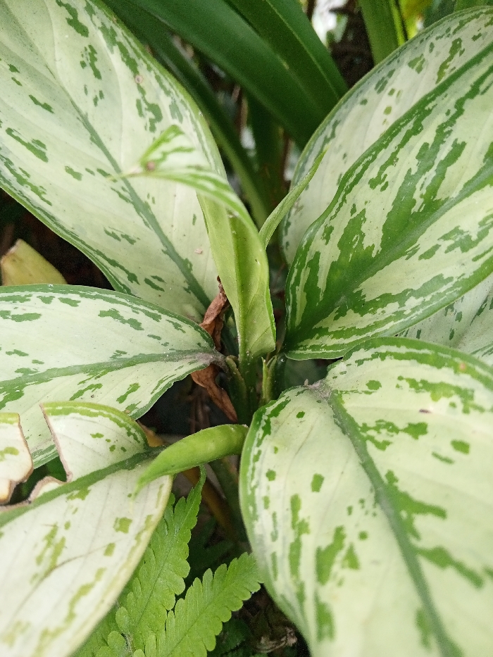 A close-up, eye-level perspective captures variegated foliage within Ciherang, Indonesia. The central subject is an Aglaonema plant, characterized by large, ovate leaves with prominent light green or creamy-white areas patterned irregularly with dark green patches and veins. Multiple leaves are visible, some fully expanded, others in various stages of unfurling, with a slender, newly emerging pale green leaf or shoot positioned at the lower left of the plant's core. A distinct, fern-like plant with finely divided, brighter green fronds is partially visible in the lower-left foreground. The background consists of out-of-focus dark green foliage. No individuals or man-made structures are present within the frame.