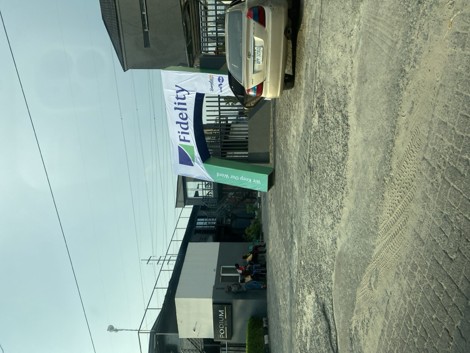 The scene is set outdoors in an urban commercial area in Ilado, Nigeria, under a pale, clear sky. In the foreground, a paved surface, consisting of interlocking concrete blocks, is partially covered with light-colored sand and exhibits multiple tire tracks. In the midground to the right, a gold-colored sedan, bearing Nigerian license plate "APP 320GD," is parked with its rear facing the viewer. The vehicle's driver's side rear door is partially ajar. Adjacent to the car, a large, inflatable archway banner, predominantly white and green, spans a black metal fence or gate. The banner displays the "Fidelity" logo (a blue and green geometric design with text) at its apex, the slogan "We Keep Our Word" vertically on its left support, and smaller "Sweatcoin" and "SME" logos near its base on the right. To the left, a multi-story building complex, constructed with dark grey and white panels, is visible. A prominent black sign attached to its facade reads "PODIUM [UNAI]". Four individuals are seated on assorted chairs outside this building, while one person stands nearby. Power lines and a metal lattice tower are visible against the sky in the background.