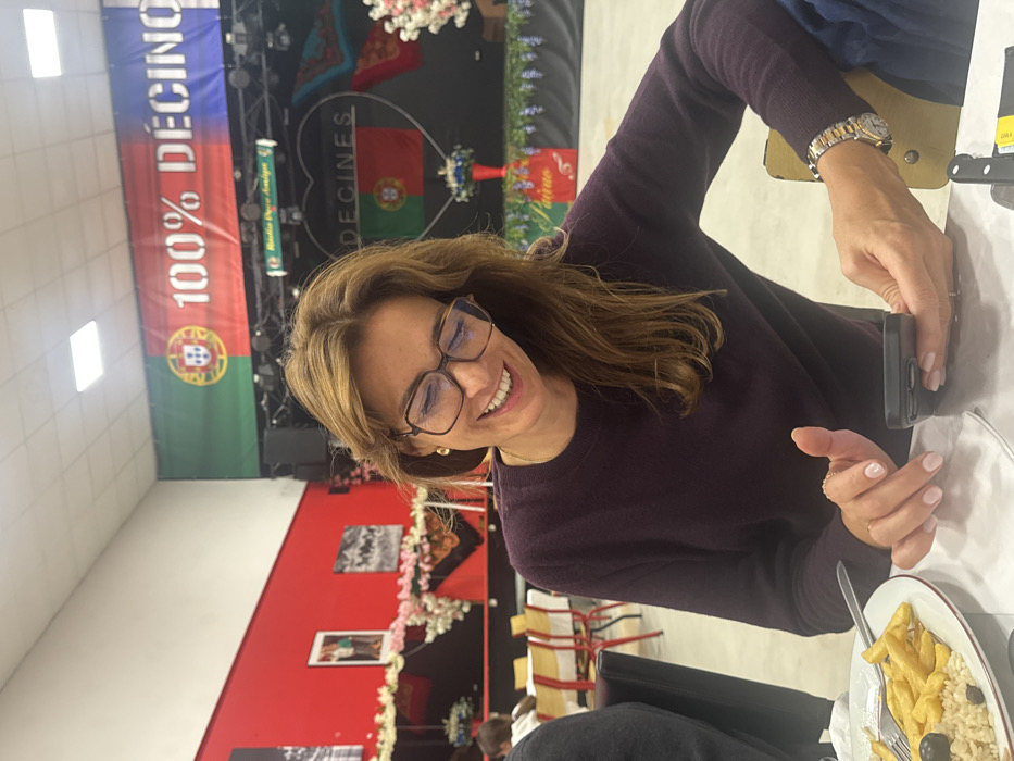 The image captures a smiling woman seated at a table in an indoor venue located in Décines-Charpieu, France