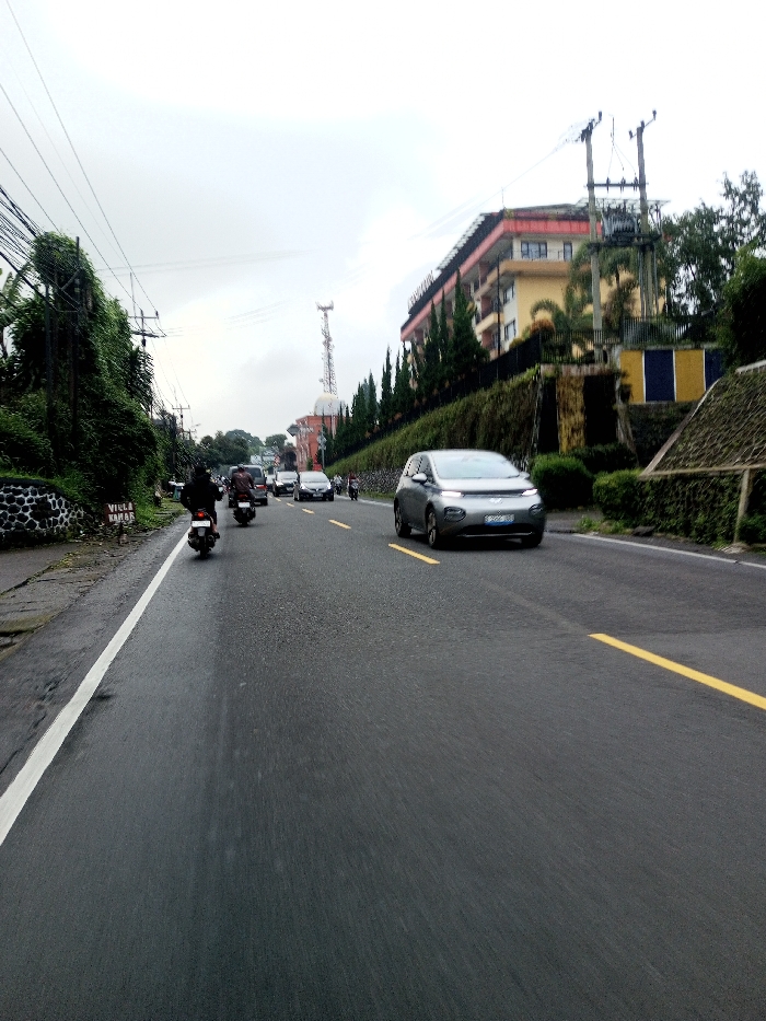 The image depicts a multi-lane asphalt road under an overcast sky in the city of Dawathang_Dorjibi_ Kashingtsawa, Bhutan. The road surface appears dark and possibly damp, featuring a solid white line defining a shoulder on the left and two broken yellow lines marking traffic lanes further right. Traffic is present, with vehicles traveling in both directions. In the foreground, a silver or light gray compact car with a distinct front light design is visible in the right lane, moving towards the camera. Its front license plate displays characters including "B" and numbers/letters. Multiple motorcycles, each with a single rider in dark attire, are observed in the left lane, moving away from the camera. Several other cars are visible further down the road, some blurred by motion or distance. Along the left side of the road, a dark, textured retaining wall or curb is visible, supporting dense green foliage, primarily vines and bushes. A white sign with dark lettering, partially reading "VILLA KAMAR," is affixed to this wall. Numerous utility poles densely strung with black power lines run parallel to the road on the left. On the right side of the road, a landscaped area with low green hedges separates the asphalt from an elevated property. Behind this hedge, a multi-story building with a red-orange sloped roof and yellow or beige walls is prominent. Tall, slender evergreen trees are planted along the property line in front of this building. Further down the road, a tall, lattice-style communication tower is visible against the sky, positioned behind what appears to be another building with a domed roof. The background is dominated by the bright, cloudy sky, with distant structures or hills partially obscured by atmospheric conditions.