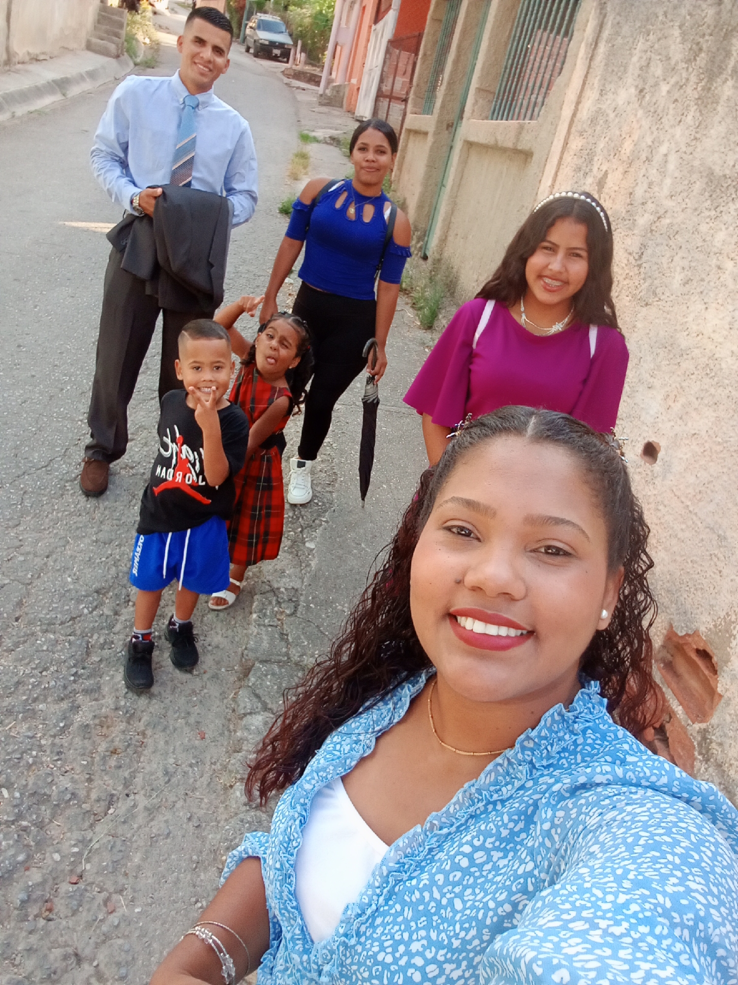 The image depicts a group of seven people standing on a cracked asphalt road in Las Tejerías, Venezuela. In the foreground is a woman wearing a light blue floral top, a white tank top underneath, and a gold necklace. She is taking a selfie, smiling broadly with red lipstick. Behind her, on the left, is a man in a light blue dress shirt and tie, holding a dark suit jacket. Next to him, a young boy wearing a black t-shirt with a red logo and blue shorts is flashing the peace sign. A young girl in a red plaid dress stands next to the boy, sticking her tongue out. Further back, a woman in a blue off-the-shoulder top and black pants holds a black umbrella. Behind her and to the right stands a teenage girl with a pearl headband and a purple top. A grey car is parked on the street in the background. The setting appears to be a residential street with weathered walls and a building with grated windows on the right. The lighting suggests it is daytime.