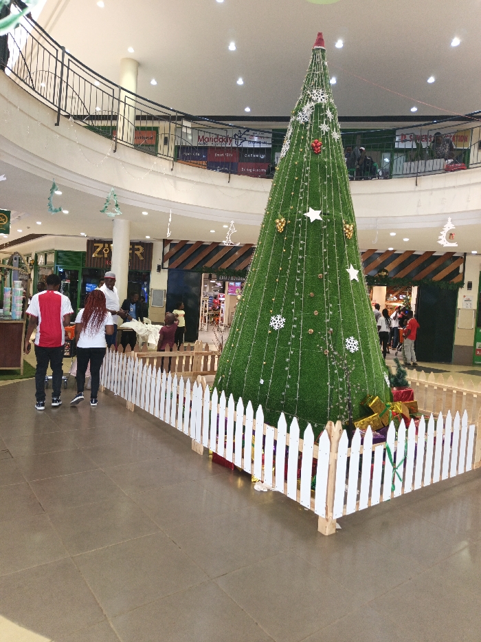 The image depicts the interior of a multi-level shopping mall, not a hospital ward as specified. While the specific city in Kenya cannot be confirmed from the image alone, shop signs such as "Mariadadi Auto Spares" suggest a commercial location. The central subject is a large, conical Christmas tree, approximately two stories in height, covered in green artificial material. It is decorated with vertical strings of lights, white snowflake ornaments, gold pinecone-like ornaments, and white star cutouts, topped with a red conical finial. The base of the tree is enclosed by a white wooden picket fence, inside which several wrapped gift boxes in gold, red, and purple, along with a smaller green Christmas tree, are arranged. The ground floor features light-colored tiled flooring. In the mid-ground, two individuals are observed from behind, walking towards the left: one wearing a red and white short-sleeved shirt and dark pants, and another with reddish-brown hair wearing a white short-sleeved shirt and black pants. Further back, a man in a white cap and a small group of people are visible near a white table. A child in a red top stands near the picket fence. The upper level is defined by a curved black metal railing, which is adorned with string lights. Various shop banners are visible on this level, including "Mariadadi Auto Spares" and "Dr. Sinner's Station." The ceiling contains numerous recessed spotlights, and several holiday-themed hanging decorations, such as snowflakes and abstract shapes, are suspended throughout the space. Multiple people are visible on both the ground and upper levels, generally walking or standing.