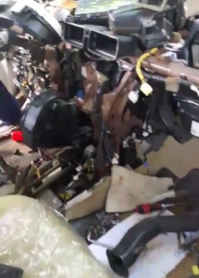 interior of a car being disassembled. The dashboard is completely removed, exposing the wiring and internal components. A man wearing a blue uniform is sitting in the driver's seat, looking at the disassembled dashboard. The seats are covered in plastic, and loose car parts are scattered throughout the interior. Outside the car, another car, possibly a Mercedes-Benz, is visible.