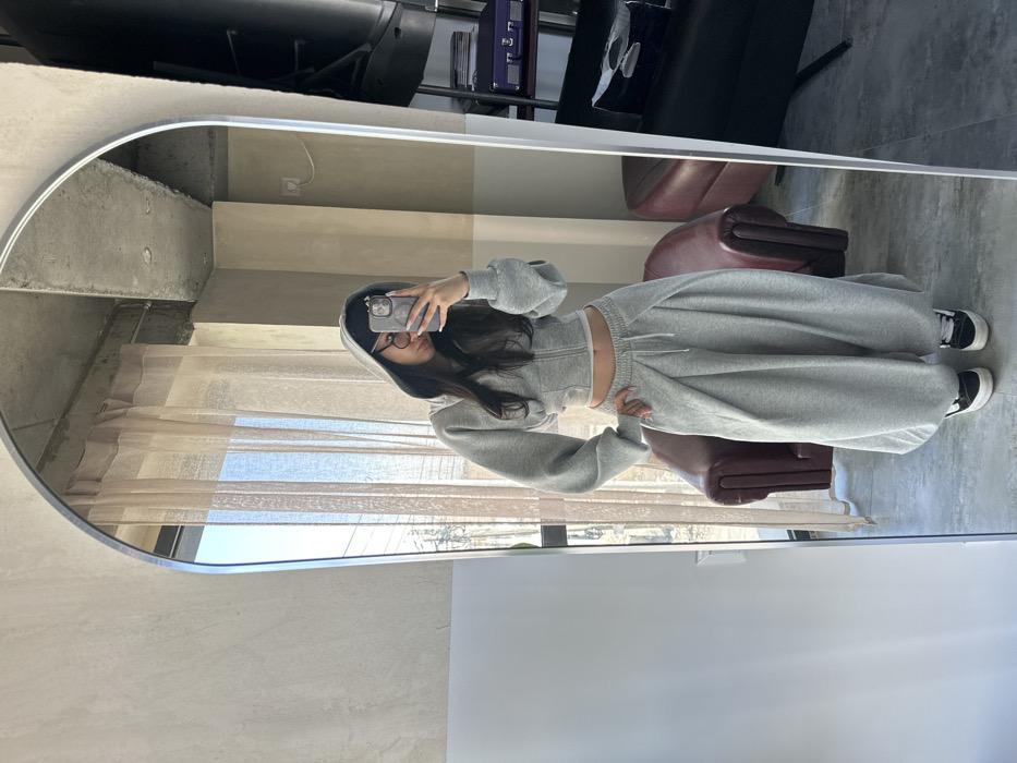A person is reflected in an arched, full-length mirror, taking a selfie with a light-colored smartphone. The individual, appearing female, has long dark hair and wears round glasses, a gray hooded cropped zip-up sweatshirt, matching baggy gray sweatpants, and black and white sneakers. One hand is placed on their hip, while the other holds the phone to capture the image. The background, visible in the mirror's reflection, shows an indoor space with a concrete ceiling and light-colored walls. To the left, a large window with sheer light-colored curtains reveals an outdoor view of blue sky and sparse vegetation. To the right, a dark red or brown leather armchair is present, along with a dark furniture unit containing a purple object. A white electrical cord is visible on the wall. This scene occurs within a building in Zovuni, Armenia.