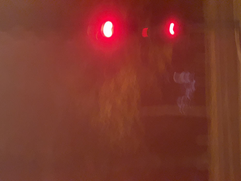 Two red lights, one a full circle and the other a crescent, illuminate the center of the frame. A series of horizontal lines are positioned between the lights. The scene is obscured by what appears to be a fog or blur, with vague outlines of objects. Hints of yellow and orange colors emerge toward the right edge of the image.