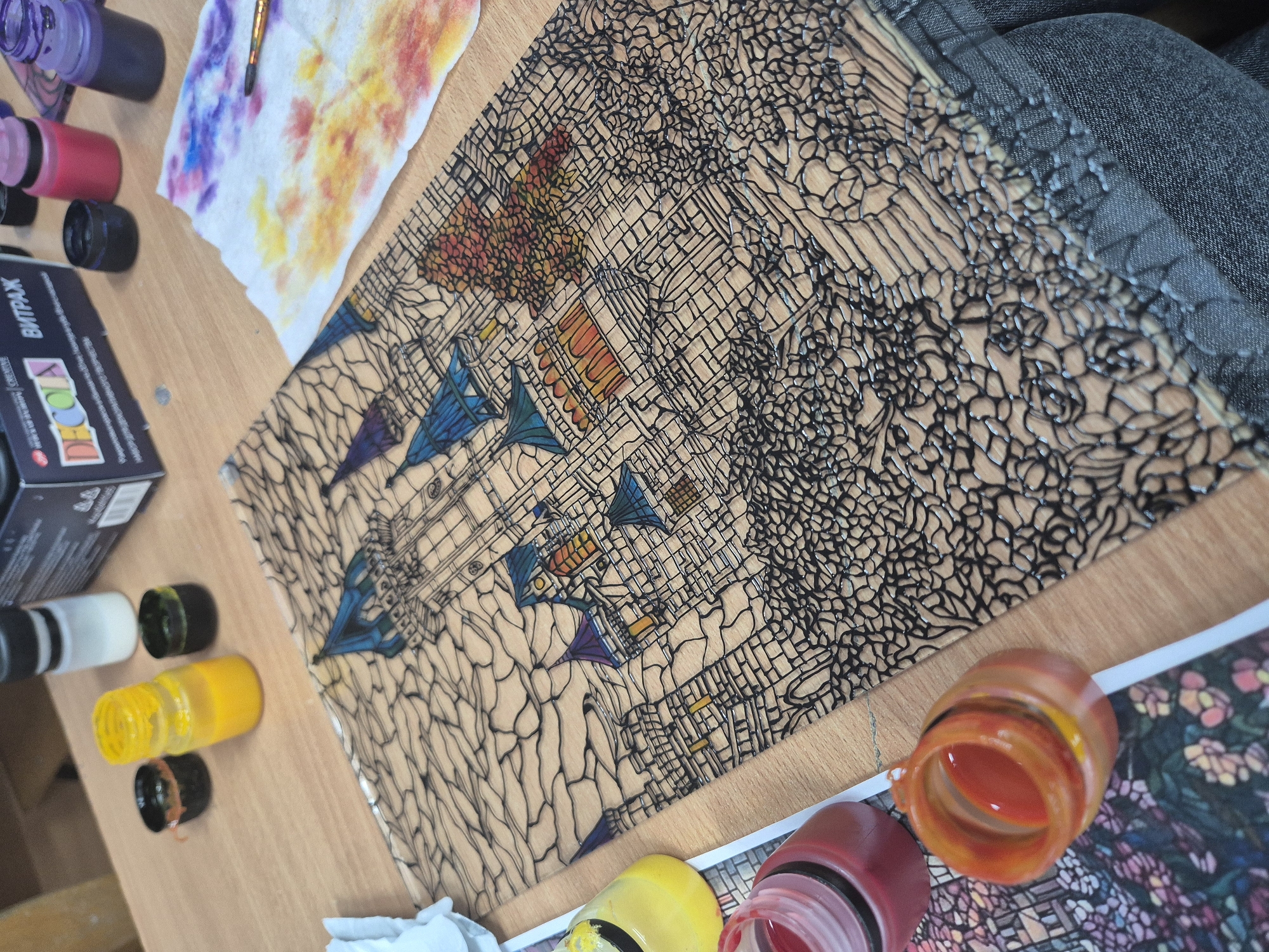 n abstract, stylized cityscape artwork in progress, possibly a glass painting or a similar medium involving outlines filled with color. The artwork is predominantly beige with black outlining, and portions are colored with blue, orange, yellow, and reddish-brown. Some areas show dense, repetitive patterns resembling foliage or densely packed buildings. It is positioned on a light brown wooden surface, possibly a desk or tabletop. Around the artwork are various materials related to painting: bottles of different colored paints (purple, red, yellow, white, and others), a black box labeled "VITRAX" and "DECOLA", a rag with paint smudges, a paintbrush, and a partially visible printed image. The edge of what looks like a pair of gray jeans is visible in the upper right. The location of Pavlikeni, Bulgaria, is not evident within the image. There are no clear indications of a specific city or geographical features that would allow for identification. The presence of the "VITRAX" and "DECOLA" branded paint suggests the artwork could be from or influenced by materials available in that region. However, without more context, it is impossible to establish the city's location based on the scene.