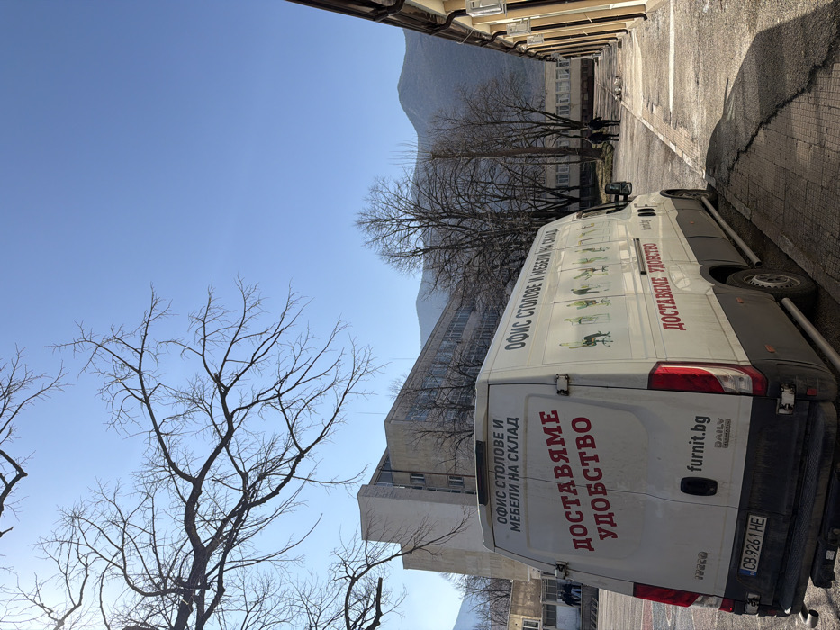 The image depicts an urban scene in Vratsa, Bulgaria, likely during winter or early spring, under a clear blue sky. A white Iveco Daily panel van, bearing Bulgarian license plate CB 9261 HE, is parked on a paved surface, angled slightly towards the right side of the frame. The van's rear displays Cyrillic text: "ОФИС СТОЛОВЕ И МЕБЕЛИ НА СКЛАД" (Office chairs and furniture in stock) and "ДОСТАВЯМЕ УДОБСТВО" (We deliver comfort/convenience) in red, along with "furnit.bg" and small illustrations of people in office chairs. To the left of the van, a large, multi-story building with a concrete facade and multiple windows is visible. A group of approximately 4-6 indistinct individuals stands near the base of this building on the far left. Multiple bare deciduous trees are scattered throughout the scene, with a prominent branch extending across the upper left quadrant. On the right, a long, lower-profile building with a brown roofline runs parallel to a paved path. Two indistinct figures are observed walking away from the camera along this path, further beyond the van. Distant mountains form the horizon line in the background. The ground consists of paved surfaces, and bright sunlight casts shadows across the scene.