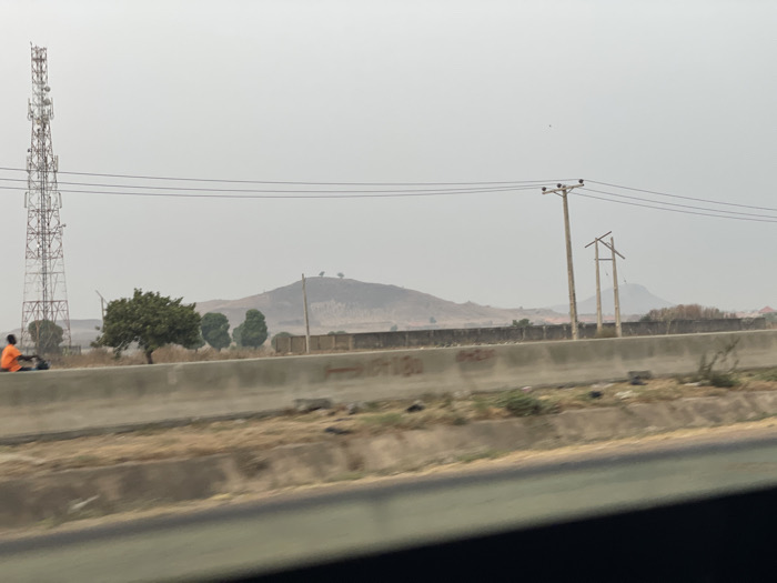 A hazy landscape features a cell tower, utility poles, and a distant hill. A concrete barrier runs horizontally across the foreground, separating the viewer from a field of dry vegetation. Several trees dot the landscape. A person in an orange shirt sits on the side of the road. The sky is overcast.