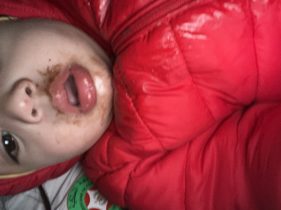 A baby's face, smeared with what appears to be chocolate or a similar dark substance around the mouth, is close to the camera. The baby's mouth is open, revealing the tongue. The child is wearing a red puffer jacket. Part of a patterned shirt peeks out from underneath the jacket near the bottom of the frame. The image is shot from an unusual angle, making the baby's face appear tilted.