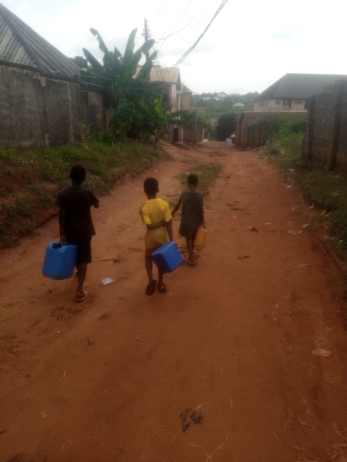 Three individuals, likely children, are observed from behind, walking away from the camera down an unpaved, reddish-brown dirt road in Ukwu-Abwa, Nigeria