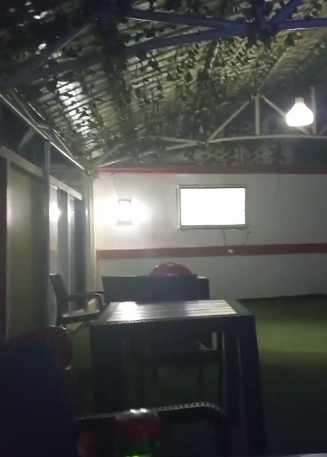 The video pans across an outdoor patio at night. The patio has a metal frame roof covered in artificial greenery. There are several tables and chairs. The floor is covered in artificial turf. The walls are white with a red stripe running horizontally along them. There is a window in the wall. A single light hangs from the ceiling. There is a bottle of something on a table in the foreground. Music is playing.