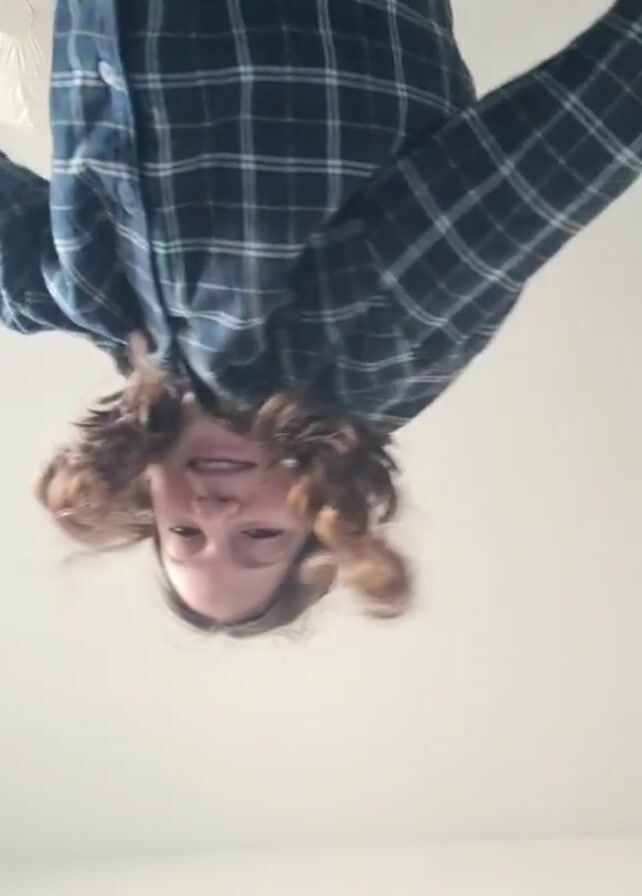 A person with shoulder-length, curly brown hair is upside down in front of the camera, looking at the lens with a slight smile