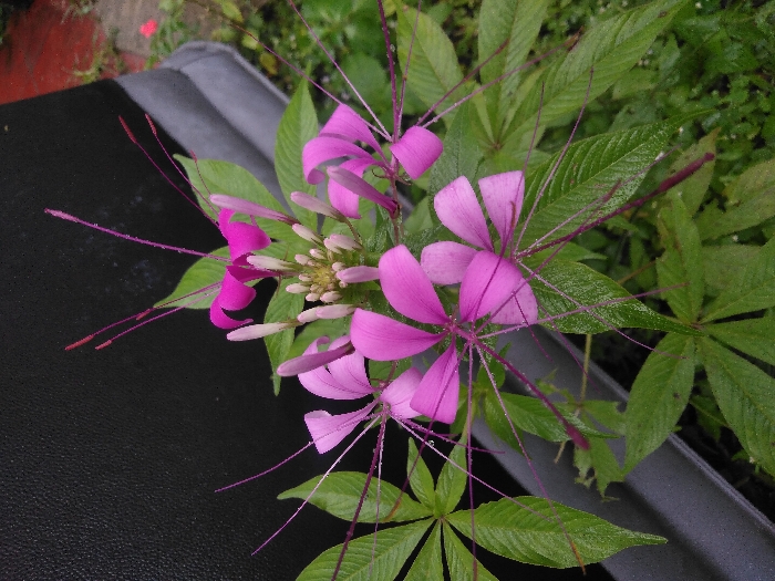 An outdoor close-up shot captured in Chupaderos, Mexico, depicts a cluster of Spider Flowers (Cleome hassleriana) in bloom. The primary subject is a vibrant inflorescence featuring multiple flowers, primarily in shades of light pink and magenta, with a central cluster of lighter-colored buds. Each open flower exhibits four petals and numerous elongated, thin stamens, creating a spidery appearance. Small water droplets are visible on the petals, stamens, and surrounding foliage, indicating recent precipitation or dew. The plant's palmate green leaves frame the flowers. In the immediate background, a dark, textured object occupies the upper left, possibly a container or fabric. A grey, corrugated or grooved surface is visible in the mid-ground, extending from the lower left towards the center. Additional blurry green foliage and dark ground cover are present in the lower right portion of the scene. No individuals, actions, or direct interactions are depicted.