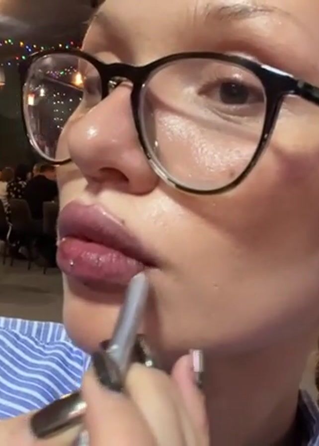 close-up of a fair-skinned woman in a restaurant or bar. She has her blonde hair in pigtails and is wearing glasses and silver hoop earrings. She is applying lip liner in front of the camera, using a silver makeup tool. She's wearing a blue and white striped shirt. The background shows other patrons seated at tables, illuminated by warm lighting and string lights. A flat-screen television is visible on the wall. The scene suggests a social gathering at an establishment with a festive atmosphere.