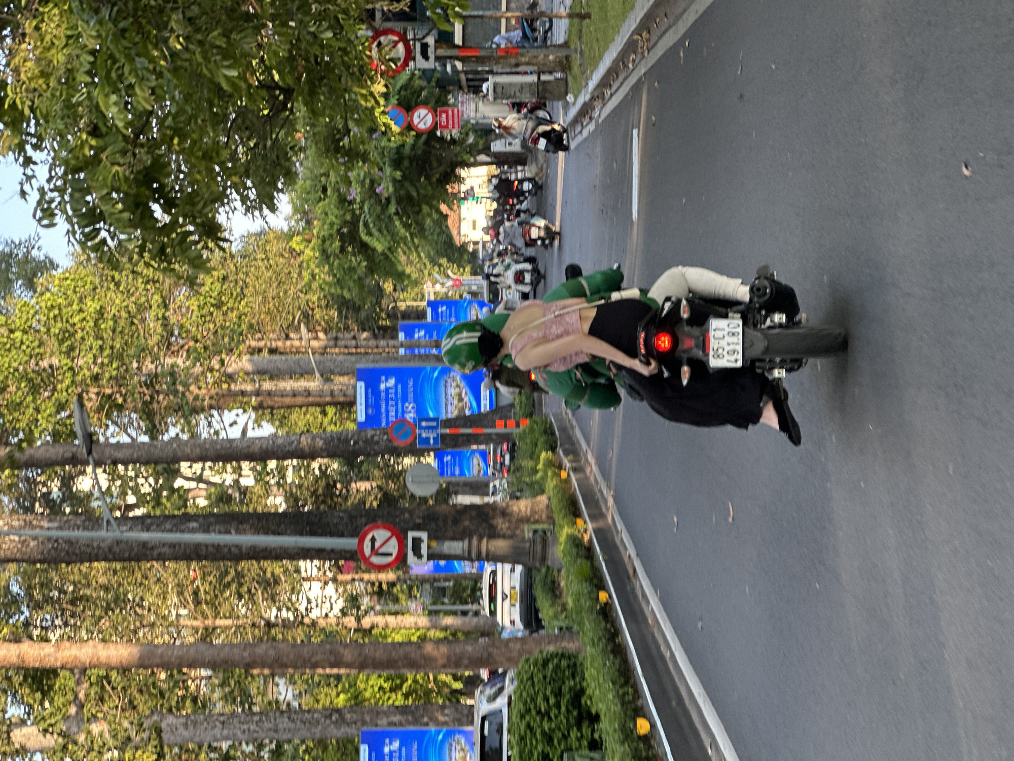 An outdoor, daytime image captured in Thủ Đức, Vietnam, depicts a multi-lane urban road, likely during late afternoon due to bright, directional sunlight and visible shadows. The perspective is from behind a moving motorcycle, which is the central subject. The motorcycle is a dark-colored model, displaying a red taillight and a Vietnamese license plate reading `85-C1 491.80`. It carries two individuals. The driver, positioned in front, wears a green helmet and a green uniform jacket or vest, suggesting affiliation with a ride-hailing service. Behind the driver, a female passenger is seated, clad in a light pink sleeveless crop top that exposes her midriff, black long pants, and black flat shoes. Her dark hair flows down her back. To the left of the motorcycle, a concrete median topped with low green bushes and yellow reflective markers separates the traffic lanes. The road is lined on both sides by numerous tall, mature trees, with streetlights interspersed among them. Blue advertising banners with Vietnamese text, including phrases like "DỰ ÁN MỚI 3,9 TỶ ĐỒNG" (New Project 3.9 Billion VND) and numerical information, are mounted on poles. Visible traffic signs include a red circular "No Left Turn" or "No U-turn" sign, a red circular "No Parking/Stopping" sign, and a white rectangular sign indicating a truck restriction. Further down the road, numerous other motorcycles and some cars are visible, participating in or stopped in traffic. A light-colored building with a dark roof is faintly discernible in the distant background on the right. The sky overhead is clear.