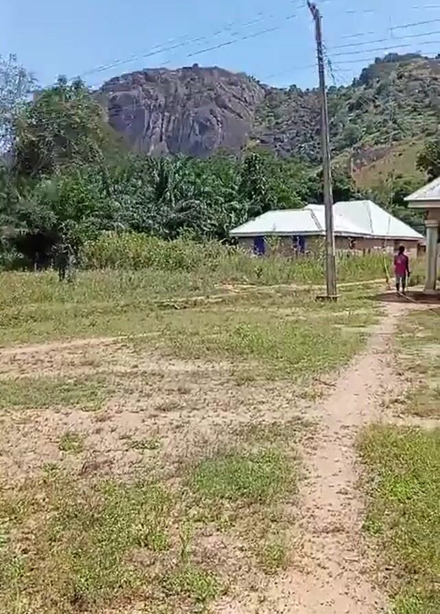 dirt path leading to a gray building with a white roof and white trim. A person wearing a red shirt is walking towards the building. The environment includes sparse grass, an electrical pole, and a mountainous landscape in the background with a clear sky. The camera moves slowly, showing a wider view of the building.