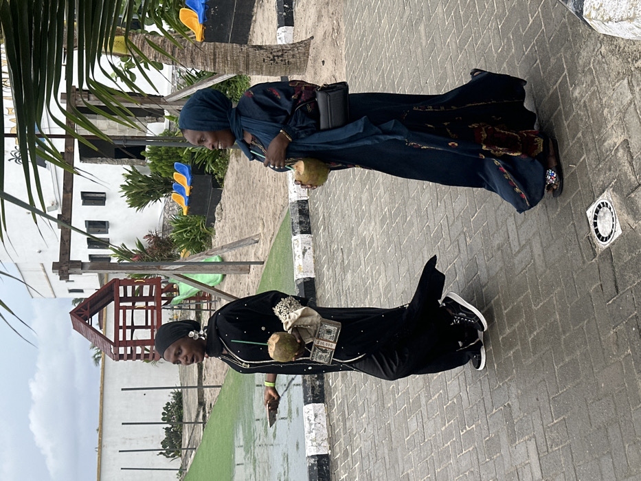 Two women are observed walking from left to right on a grey interlocking brick paved surface in Mopo Onijebu, Nigeria, under an overcast sky. The woman in the foreground wears a black hijab, a long black embellished abaya with visible black pants, and black high-top sneakers with white soles. She holds a green coconut drink with a straw in her right hand, a small flat dark object in her left hand, and carries a rectangular clutch purse designed to resemble a stack of US dollar bills. Her mouth is open, and she wears large silver earrings. The woman slightly behind her wears a dark blue/teal hijab, a long dark dress with patterned sections, and dark sandals with colorful beaded embellishments. She holds a green coconut drink with a straw in her left hand and carries a small black shoulder bag. She is smiling and looking towards the first woman. The environment includes a black and white striped curb separating the pavement from a wet green artificial turf patch, a sandy area, a red wooden playground structure with a green slide, a white building with dark windows, and rows of blue and yellow plastic chairs. Palm tree fronds are visible in the upper right. A circular metal utility cover is present on the paved ground.