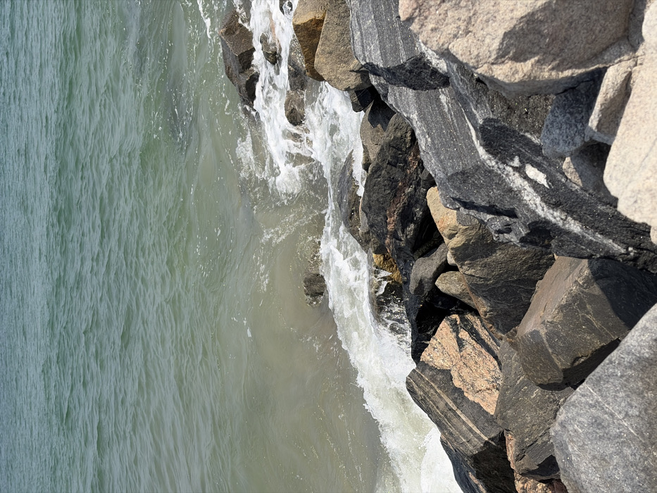 The scene depicts a coastal area in Alaguntan, Nigeria. The upper two-thirds of the image shows an expanse of teal to muted green water exhibiting surface ripples. Along the lower third, a dense accumulation of large, angular rocks forms a barrier. These rocks display varied coloration, including dark grey, black, reddish-brown, and light beige, with some exhibiting visible mineral striations. White, aerated waves are actively breaking against and receding from the rocks along the water's edge, indicating dynamic water movement. No human or animal subjects are present. The environment is brightly lit under natural daylight, casting distinct shadows among the rocks.