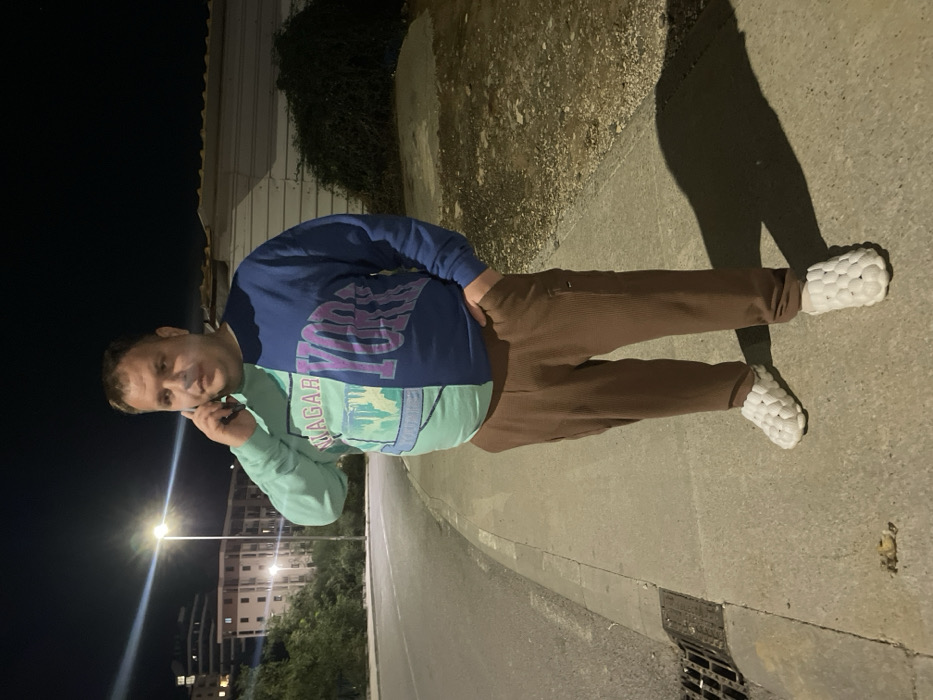 A male subject stands on a concrete sidewalk at night in Boreti, Montenegro
