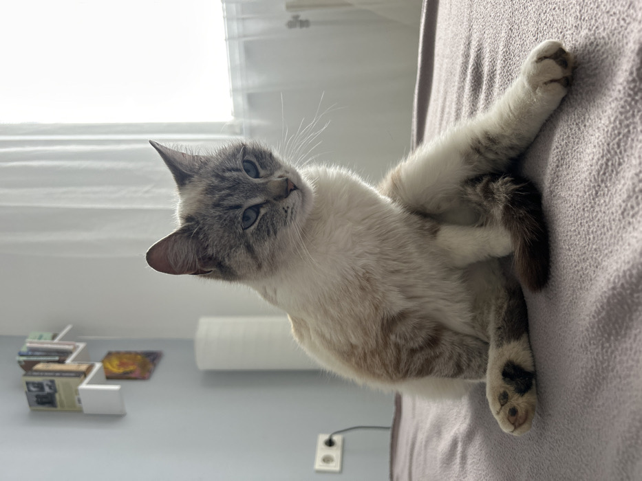 - "This interior scene, located in the city of Yablanitsa, Bulgaria, features a cat seated centrally on a light purple, textured bedspread" by FM-qqrhH3, licensed under CC BY 4.0