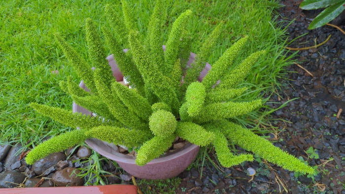 - "An overhead view captures a vibrant green plant, identified as an Asparagus fern due to its dense, bushy, and cylindrical fronds, situated within a rounded, light brown or terracotta-colored pot" by FM-QrecA3, licensed under CC BY 4.0
